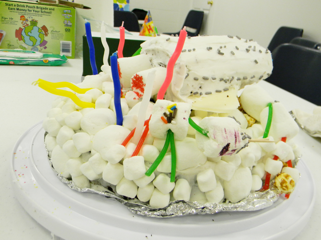 So, naturally, I beg for the opportunity to do the special cakes for their birthdays. Last year, I built the circus tent cake, followed by the cheeseburger cake. This year, the first cake was, again, chocolate cake, but with white fluffy whipped frosting and almond bark (aka white chocolate), plus a bazillion other ingredients.